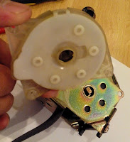 สาเหตุคราวนี้ไม่ได้มาจากปลายสปริงหลุดออกจากแกนม้วน แต่มาจากการที่เบ้าล็อคแกนสปริงที่สวมกับแกนสายเข็มขัดถอยออกแล้วหลุด เนื่องจากความอ่อนตัวของพลาสติกครอบใสๆที่เรามองเห็นในรูปนั่นแหละ ปริงจึงมีแรงดันถอยกลับไปได้