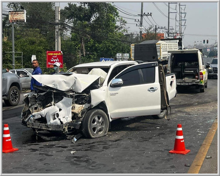 ก่อนที่จะไปถึงบริเวณสามแยกปากทางเขื่อนแม่งัดสมบูรณ์ชล ซึ่งคนขับพยายามเลี้ยวให้ไปตามทาง แต่เนื่องจากควบคุมได้ยากทำให้ไปชนกับรถยนต์กระบะคันหนึ่งที่สวนทางมา ก่อนจะไปเสาไฟฟ้าและไปหยุดอยู่กับเกาะกลางถนน โดยผู้ได้รับบาดเจ็บจากเหตุการณ์นี้รวมทั้งหมด 5 คน เป็นผู้โดยสารที่นั่งมากับรถกระบะสี่คนและโชเฟอร์รถบัตรอีกหนึ่งคน ทั้งหมดอาการปานกลาง หนักสุดแขนหัก