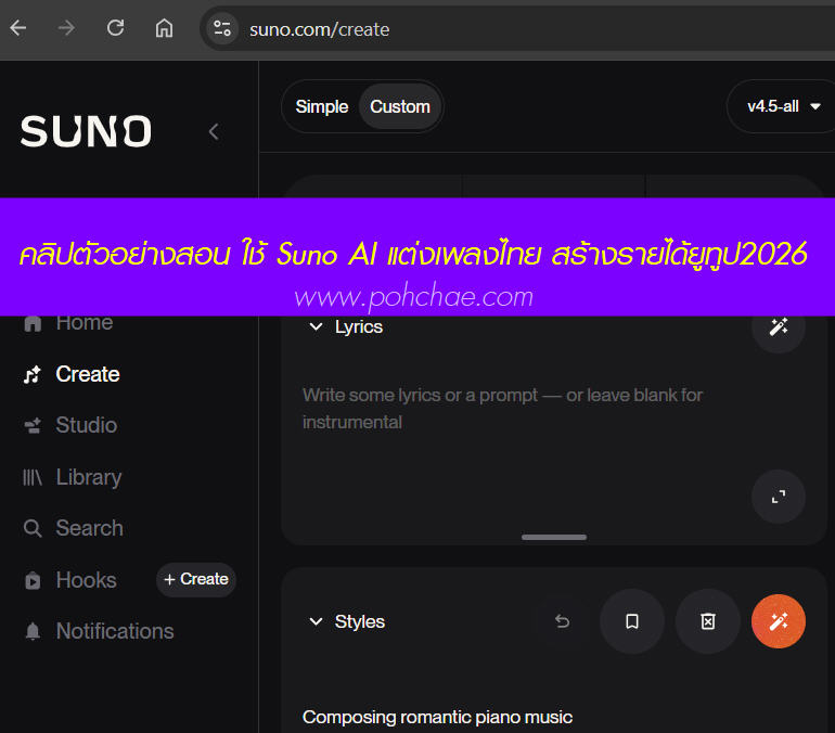 คลิปตัวอย่างสอน ใช้ Suno AI แต่งเพลงไทย สร้างรายได้ยูทูป2026